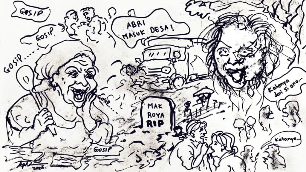 Semasa hidup, Mak Roya adalah “ratu” dapur sekaligus biang gosip yang memecah belah warga. Ironisnya, setelah mati mengenaskan, ia tetap menjadi pusat desas-desus lewat cerita hantu yang gentayangan. Benarkah ia kembali, ataukah hantu itu hanya wujud rasa bersalah dan kemunafikan kolektif warga yang gemar bergunjing?