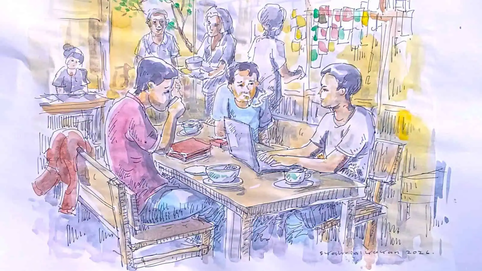Di Warmindo Mang Asep, saya sengaja berlama-lama memesan nasi orak-arik kesukaan saya. Saya tidak ingin lekas menemui Muqor yang sibuk dengan laptopnya. Ketika mendengar suara klakson dari arah tempat parkir, saya tahu itu berasal dari motor Falendra. Namun, saya masih tak beranjak dari tempat saya. Saya ingin ke sana setelah Muqor berbincang dengannya.
