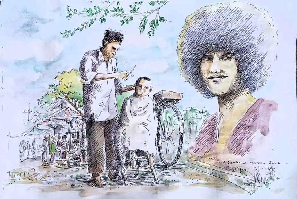 Tukang cukur itu memompa gunting kodoknya dengan tangan kanan, dan tangan kirinya terus menggerakkan sisir. Sesekali badannya mundur beberapa langkah untuk memastikan bahwa hasil cukurannya sudah rata antara kiri dan kanan, presisi di bagian depan dan belakang. Ketika tukang cukur itu hendak meratakan rambutku sekali lagi, aku iseng bertanya.