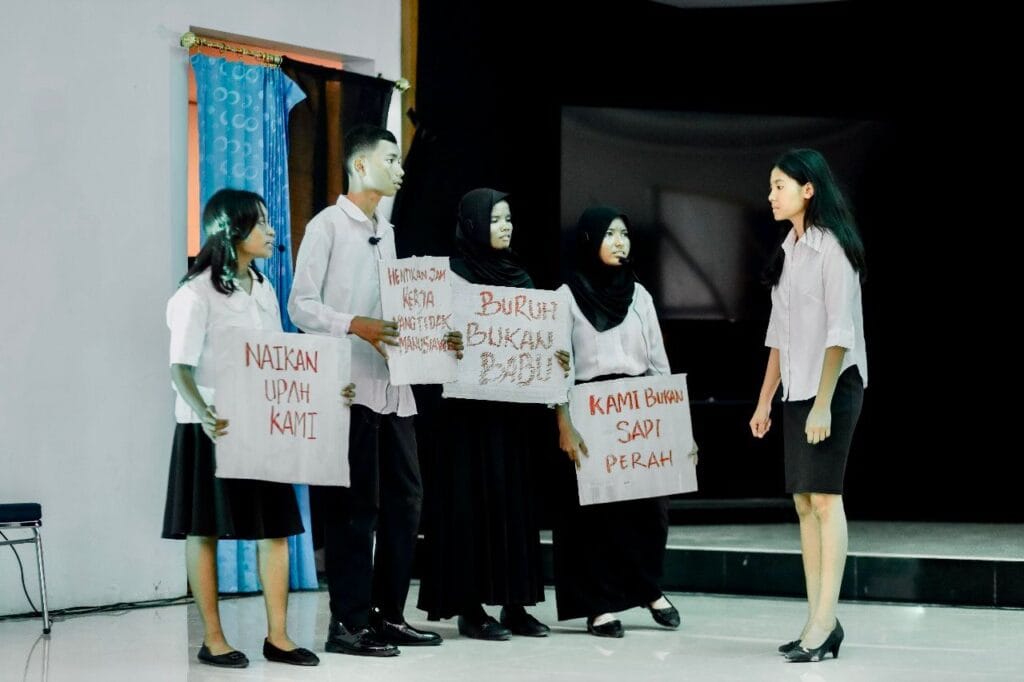 Pekikan kesakitan Marsinah sudah selaiknya jeritan. Chatrine Boritnaban, yang masih SMA itu, membuat Perempuan dalam gedung ikut merintih. Ia merangkak, merayap, beringsut, sembari menemukan keadilan dalam setiap kata yang diucapkan. Beberapa kali suaranya out of tune dan nyaris tidak terdengar apa yang diucapkan, tapi tertutupi oleh kesungguhannya dalam pemeranan.