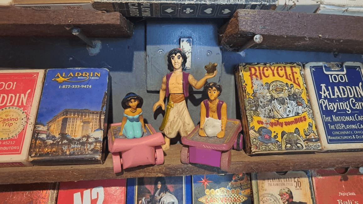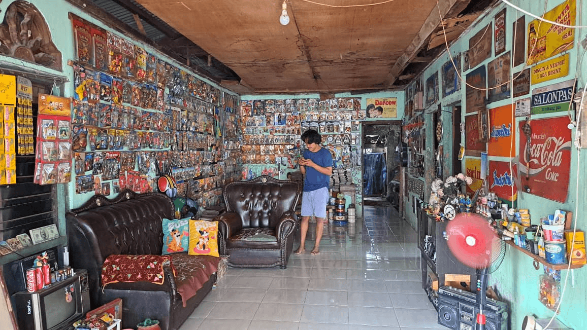 Selain buku, ruang tamu galeri dipenuhi dengan mainan jadul yang berjejer seperti aneka patung kertas dan boneka-boneka plastik yang akrab dimainkan anak-anak tahun 80-an dan 90-an. Sebagian besar mainan-mainan tersebut masih terbungkus dalam kemasan. Jika duduk di karpet, pandangan kita akan lurus menghadap sofa di bagian tengah ruangan yang mulai mengelupas, koper jadul dari besi, kumpulan uang kuno baik kertas maupun logam, dan beberapa buku lainnya juga ditumpuk di bagian sudut ruang tamu yang lain. Beberapa bagian loteng sedikit terbuka, atap rumah mengintip dari sana.