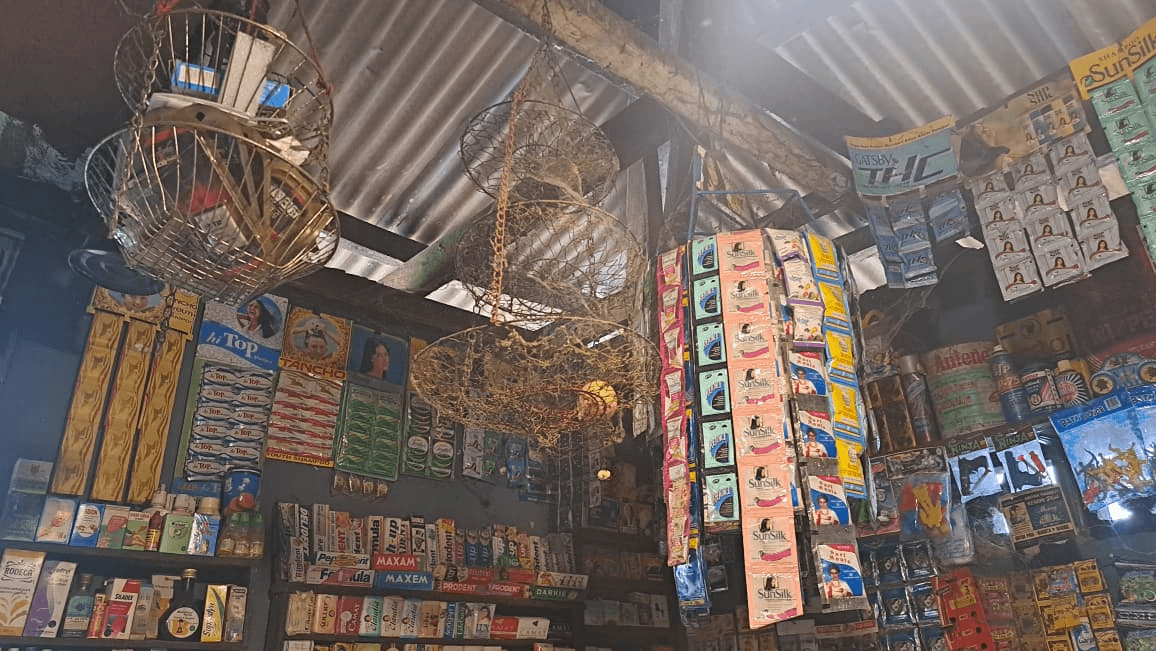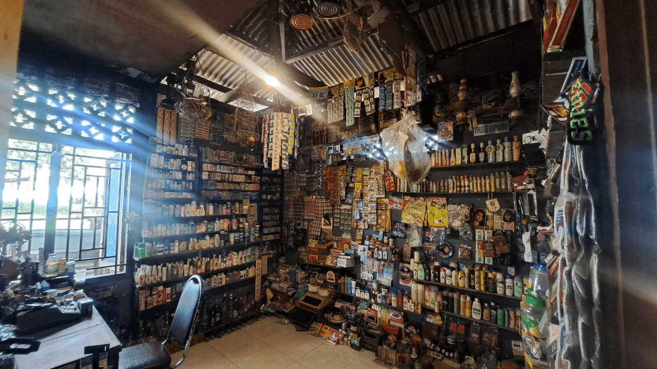 Dari luar, bagian dalam ruangan terlihat jelas karena jendela di depan bangunan dibiarkan terbuka lebar. Papan bertuliskan merek mi instan seperti Indomi dan Sarimi dalam kemasan lama digantung pada langit-langit teras. Sedikit mengingatkan akan warung kopi masa lalu– jaman dulu (jadul).