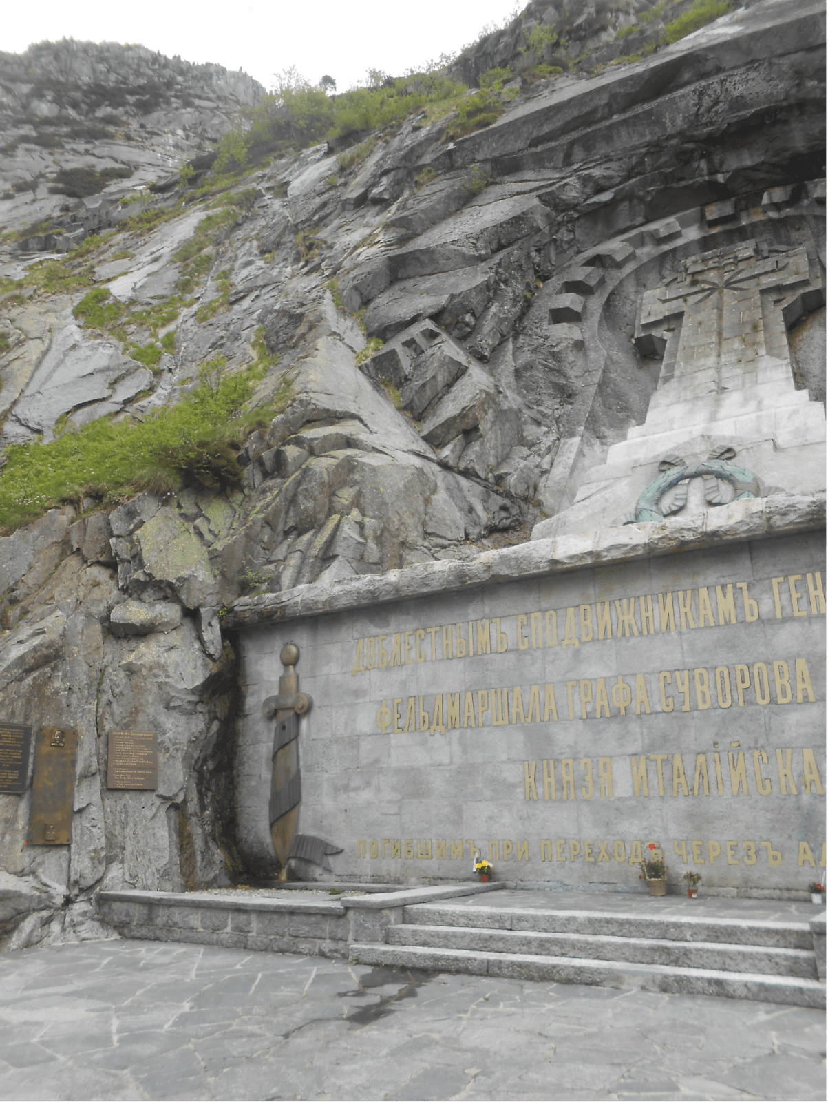 Kami beranjak ke Monumen Suvorov di bawah jalur panjat tebing. Monumen ini dipahat pada batu gunung untuk memperingati perjuangan pasukan Marsekal Aleksandr Suvorov yang memimpin 21.000 tentara Rusia dalam pertarungan sengit yang dikenal sebagai “Pertempuran di Saint-Gotthard” melawan pasukan agresor Napoleon Bonaparte dari Prancis yang dipimpin Kolonel Dumas pada 1799. Dalam pertempuran itu, ratusan serdadu gugur sebagai martir dan berkubur di jurang dalam yang disebut Schöllenenschlucht atau Ngarai Schöllenen.