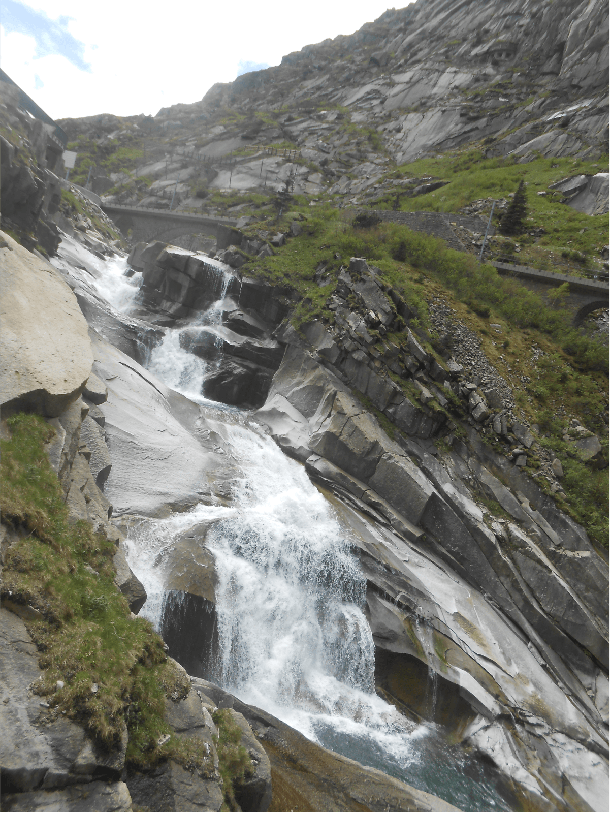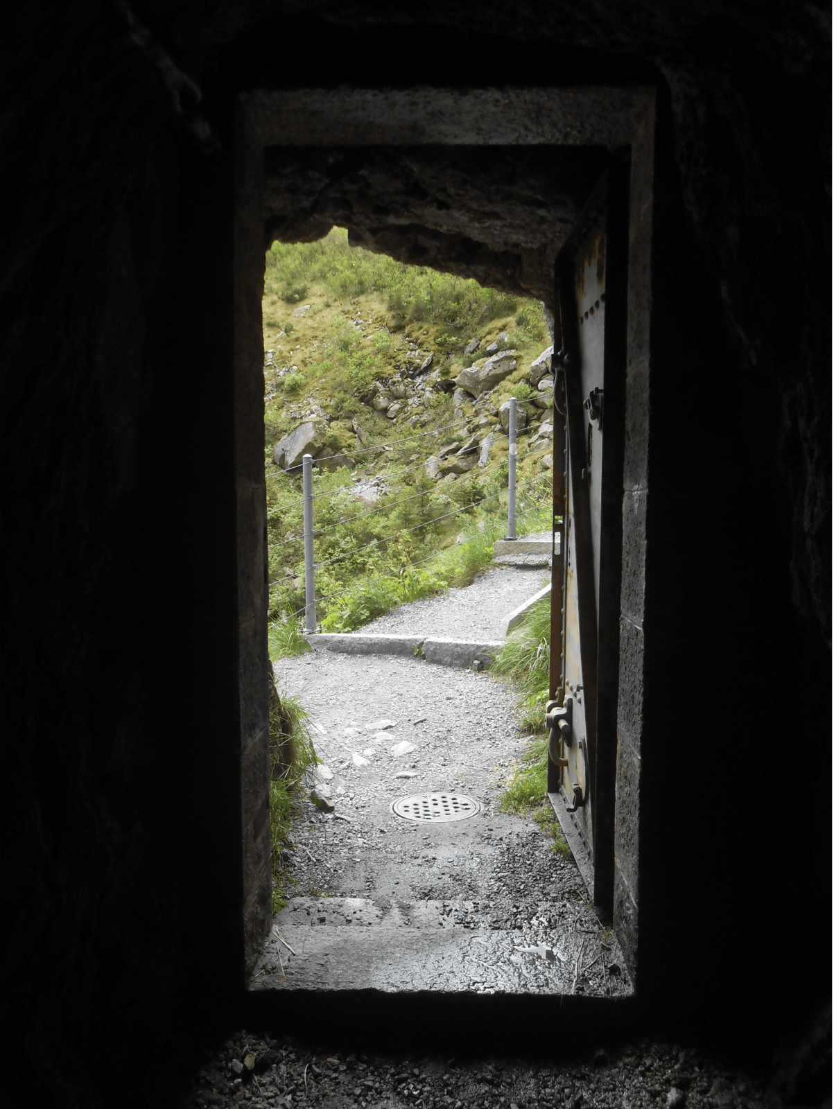 Saya merayap perlahan seraya menyalakan lampu senter dari ponsel untuk menerangi jalan. Tercium aroma lembap dan pengap. Kami berjalan sekitar seratus meter sebelum menemukan ujung lain terowongan. Dari ujung situ kami bisa menyaksikan aliran deras Sungai Reuss di bawah jurang.