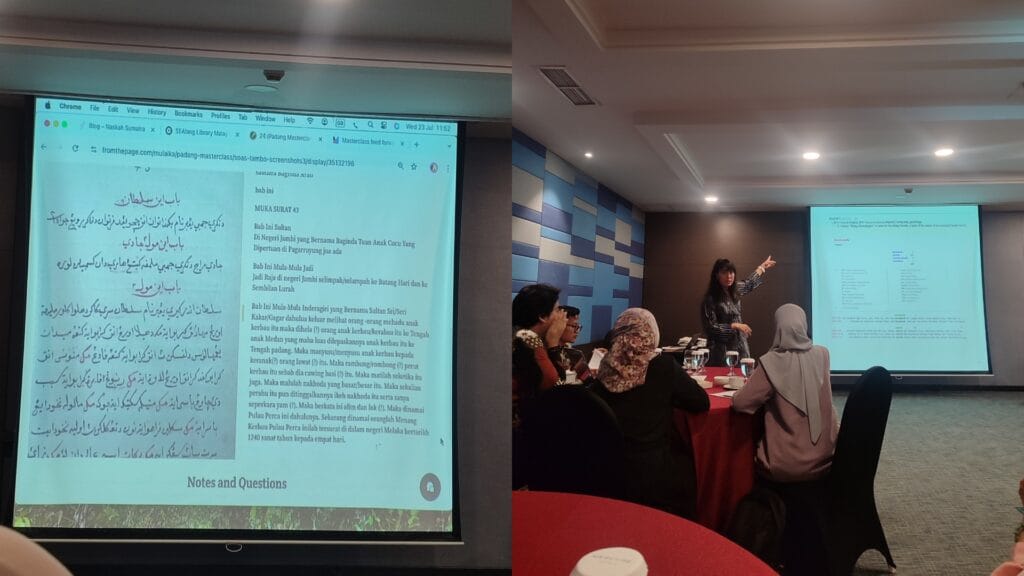 Dr. Mulaika Hijjas, peneliti utama dalam Pemetaan Budaya Manuskrip Sumatra dari Universitas SOAS (London) menyelenggarakan kegiatan ini bekerja sama dengan Prof. Pramono dari Universitas Andalas (Indonesia). Sebanyak 22 orang peserta dari berbagai perguruan tinggi, baik dari Indonesia (Sumbar, Riau, Aceh, Yogyakarta, dan Solo), maupun dari berbagai perguruan tinggi ternama di dunia (Inggris, Singapore, Jerman, Amerika, dan Malaysia) menjadi peserta dalam Masterclass Naskah Sumatra ini. Kegiatan yang diadakan di Hotel Mercure pada 23—24 Juli 2025 ini menjadi sebuah pengalaman berharga bagi saya karena diberi kesempatan bertemu dengan para mahasiswa sarjana, magister, dan doktoral yang memiliki minat khusus terhadap manuskrip.